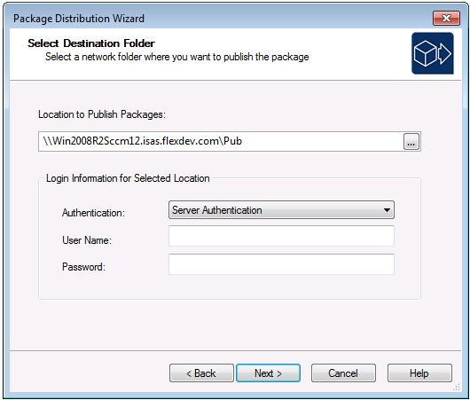 Location to Publish PackagesEnter a target path, in UNC format ( \\\\Server\\Share ), of the location where you want to publish the selected packages. Make sure that you enter a location that the ConfigMgr server has access to.