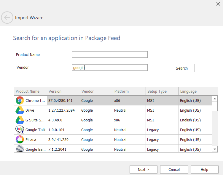 9. Click Next. When using the Package Feed Module, dynamic custom panels will appear in the Import Wizard based on the settings defined for each package. For example, when importing the Google Chrome package, several dynamic custom panel will appear, including the Options panel. ![](/images/Options panel.PNG)