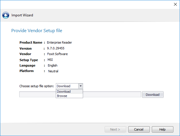 7. When you have finished downloading the setup file to the package feed configured download path, click Next. The Silent Command Line Arguments panel loads.