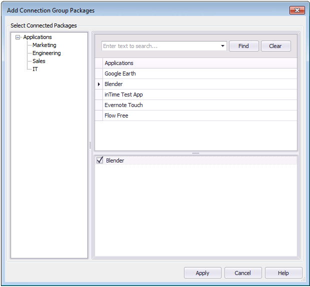 9. Under Select Connected Packages, select the group in the tree that contains the App-V package that you want to add to the connection group. The packages in that group are listed under Applications.
