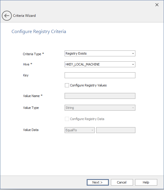 Value NameEnter the registry value name that you are using in this criteria. This field is enabled only when the Configure Registry Values check box is selected.