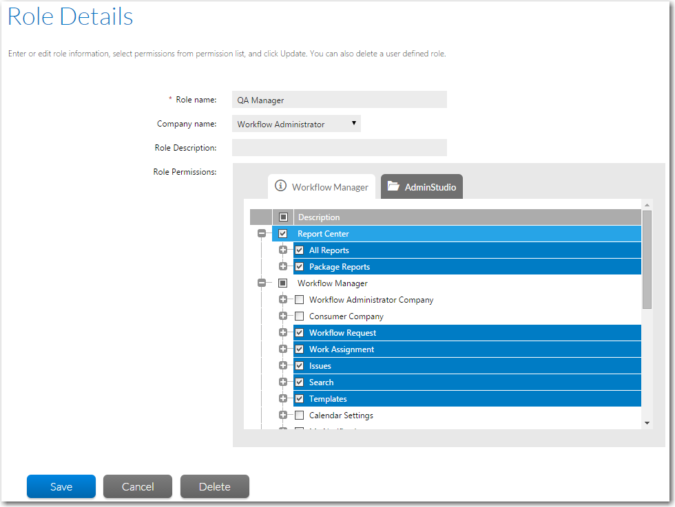 5. Click Save to save your changes and return to the Role Administration page. To exit without making any changes, click Cancel.