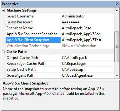 9. In the Properties window under Machine Settings, enter the name of this snapshot in the App-V 5.x Client Snapshot field.