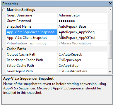 9. In the Properties window under Machine Settings, enter the name of this snapshot in the App-V 5.x Sequencer Snapshot field.